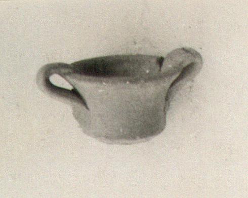 | Description: | From a small cup or bowl with nearly straight sides and thin walls, the edge slightly grooved on the outside. Over part of a festoon, painted in thick buff on the black glaze, the letters: <graphic> Clay, fine pinkish-buff, with a micaceous slip(?) over the unglazed inside. | |
