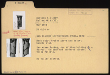 | Description: | Neck only; broken above and below; handle stub. Two women facing, one of them holding a mirror. Chitons and bordered cloaks. White fillets. No relief contour. | |