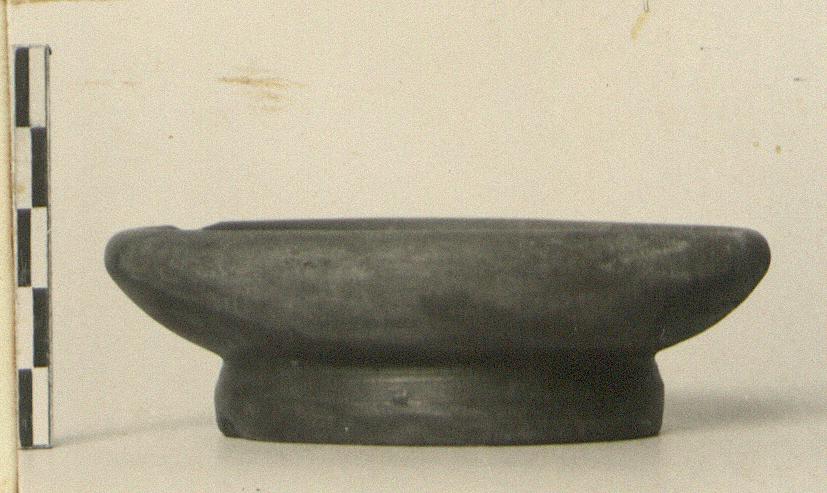 | Description: | Intact. A small shallow bowl with broad heavy foot. Plain rounded rim. Black glaze fired purplish from stacking at center; much worn from upper part. Clay burned gray. | |