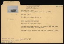 | Description: | Fragment missing from rim. Outside unglazed except for handle, narrow band on wall and rings on underside. Inside glazed except for rim and rings on floor. | |