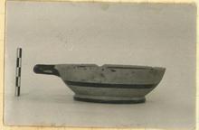 | Description: | Fragment missing from rim. Outside unglazed except for handle, narrow band on wall and rings on underside. Inside glazed except for rim and rings on floor. | |