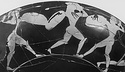 A) and B) Fight. On each side there are two pairs in single combat, with a warrior at center between the two pairs. The pair at the right, on each side, consists of a warrior and a youth wearing, on A, short himation and wreath, and carrying a shield; on B, short sleeved chiton, wreath, and carrying a sword.