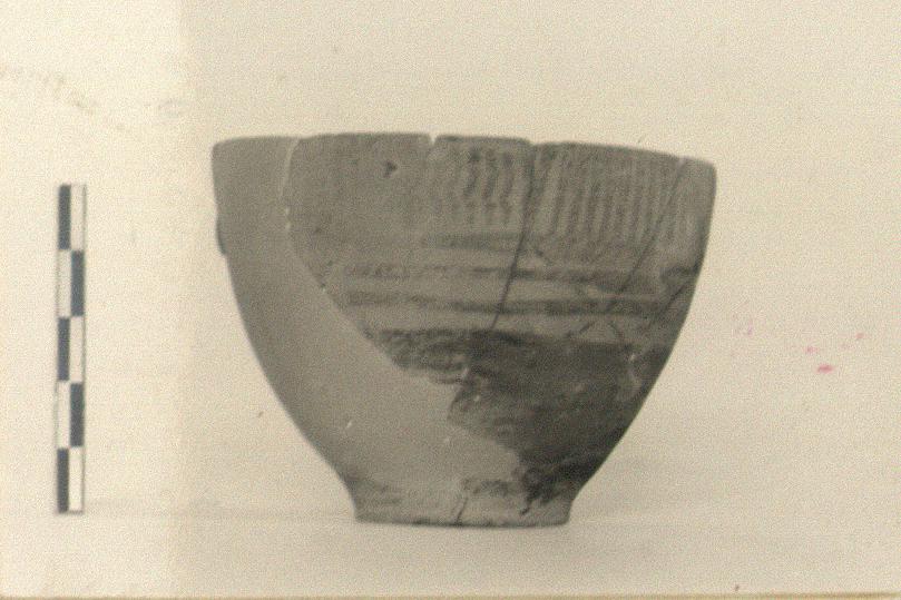 | Description: | Mended from many fragments; profile complete, handles missing. Restored in plaster. Small skyphos; Attic imitation of Protocorinthian. Flat base. Groups of straight and wavy lines around rim; below, alternately glazed and reserved bands, then glaze to bottom. Dirty pinkish clay, thin black glaze largely peeled off. | |