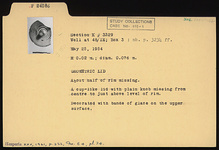 Description:   About half of rim missing. A cup-like lid with plain knob missing from center to just above level of rim. Decorated with bands of glaze on the upper surface.