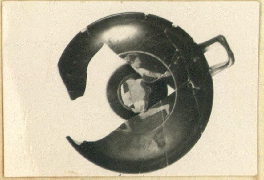 | Description: | Mended from many pieces; much of rim and wall and parts of medallion missing. Type B; thin disk foot. Reserved band around tondo; within, a boxer running left and looking around; he still holds his hands in the attitude of fighting: left arm extended and right drawn back for striking; both hands clenched; he has thongs (himantes) on both hands. Outside plain. Relief contour. Inscription once red: <graphic> Clay largely fired gray. For thongs bound around wrists only, cf. cup in Bologna with two boxers, CVA, pl. 1, 1 (ARV, p. 71); the style also not far off. | |