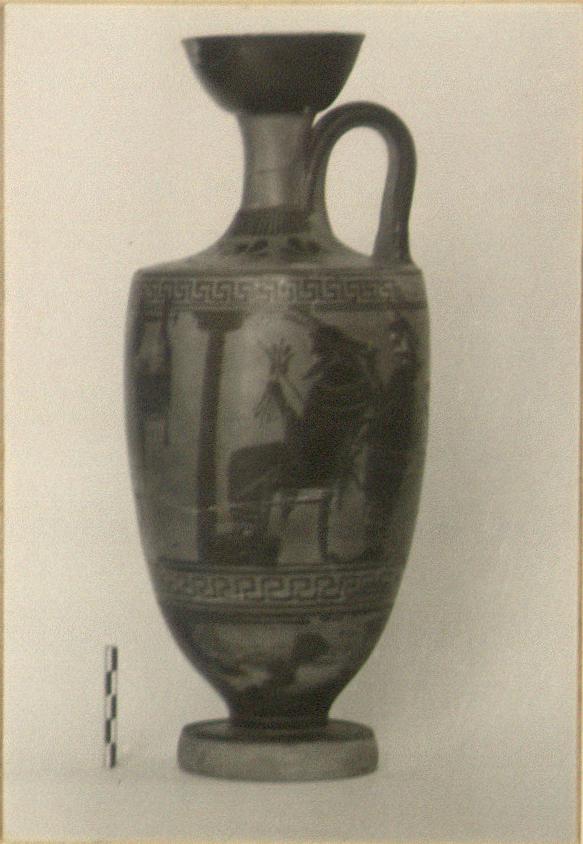 | Description: | Mended from many pieces; a few wall fragments missing. Torus mouth; rim flat on top; shoulder tending to be flat; moulded ring above foot; unusually moulded foot. On shoulder, thin rays and palmettes (two, three, two). Above picture, key leftwards; below, rightwards. A procession of gods approaches the palace of Zeus, which is indicated by a Doric column. From left to right, Herakles, Athena, Hermes, Apollo; then the column, and Zeus seated whithin, holding the thunderbolt. Standing behind him, Hera. Added red and white; glaze thin and brown in places. | |