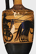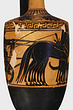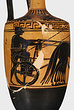 Man mounting chariot, right; himation, greaves, wreath; he holds the reins with both hands and the goad in the right. Near the front legs of the horses and behind them walks a dog. In front of the team, a Doric column. White for the wreath and dots of himation, also patches on the third horse and a stripe on the belly of the dog.