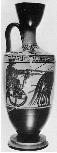 | Description: | Mended from many pieces; a few small wall fragments missing. Deep bell mouth; neck inset from shoulder; sloping shoulder; thick ring at base of wall; elaborately profiled foot. On shoulder, tongues and palmettes with dots (three and two); lotus buds next handle. Key right above picture; glazed line as ground line and a couple of red lines below at the top of the glazed wall. Man mounting chariot, right; himation, greaves, wreath; he holds the reins with both hands and the goad in the right. Near the front legs of the horses and behind them walks a dog. In front of the team, a Doric column. White for the wreath and dots of himation, also patches on the third horse and a stripe on the belly of the dog. Gela Painter. Cf. the people and the dog on Haspels (1936), pl. 24, 2a (also the chariot and horses though not so completely). For the profile of the foot, cf. Haspels (1936), pl. 26,1, but the mouth differs. For the foot of this and of the fountain house lekythos (P 24106), cf. also Jacobsthal, O., pl. 54a (for the fountain house) and pl. 54b (for this piece). | |