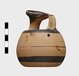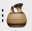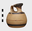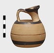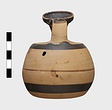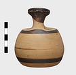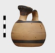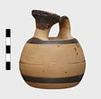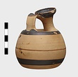 | Description: | Small hole in side; otherwise intact. Small duck askos, with rounded wall and large central opening; spout tilts back to join band handle; shallow bell mouth. Pinkish-buff clay; thin fabric, neatly finished. Black glaze on the mouth inside and out, on the top of the handle, and for a broad band at top and bottom of wall, with a narrow band between. Cf. the series of similar vases from the Heraion at Delos (Délos X2, pls. XVI-XVIII: "Vases couronnés, Rhodo-Ioniens"; the banded decoration as pl. XVI:104). | |
