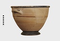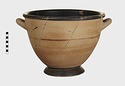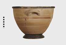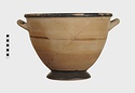 | Description: | Mended from many pieces; complete except for small bits. Small echinus foot; deep bowl; narrow rolled rim, only slightly projecting; rather small handles, set well up towards rim and somewhat uptilted. Firm thick somewhat dull black glaze inside and on rim; thinner on foot. Dilute wash on walls outside; a brown band below the handles. Slight traces of wear on the floor. Cf. Agora XII, no. 1781. | |