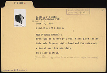| Description: | From wall of closed pot. Dull black glaze inside. Nude male figure, right; head and feet missing; a basket over his shoulder. No relief contour. Cf. Pfuhl (1923), fig. 468, a suggestion for the shape of the object he carries. | |