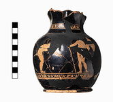 | Description: | The height is preserved nearly to the rim but very much is missing; restored in plaster. Egg and dot border above and below panel; reserved line at sides; at left, a boy, right, poised to jump: arms outstretched, knees bent, feet together; facing him, Eros, standing, holding a staff in his outstretched right hand. No relief contour. | |