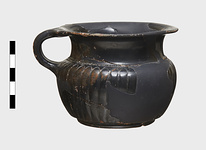 | Description: | Mended from many pieces; parts of rim and much of wall missing. Low ring foot; wall above offset; flaring rim; double handle with shouldering. Nicked band at base of rim. On the wall, petal ribbing, carried neatly round at the tips (no arc stamp). Good glaze all over. Cf. Agora XII, no. 217. | |