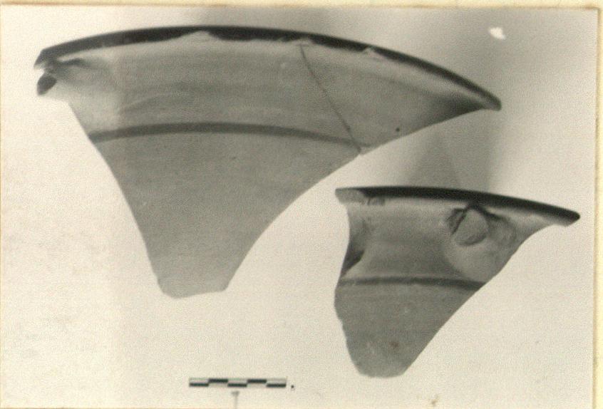 | Description: | Two fragments preserve parts of rim and wall, with the attachments of one handle, and one stub of the other. Steep wall; rim flat on top, overhanging; rolled handles set close up under rim. Parts of two large letters preserved on each fragment, scratched through the glaze on the wall inside: <graphic> Good hard fabric. Glaze on inside and on rim, firm dark brown; on the outside, a red band below the handle attachments. | |