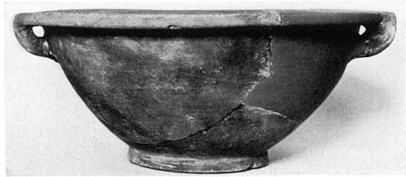 | Description: | Three joining fragments give much of the base and part of the wall and rim, with one handle attachment; two other fragments give parts of the wall and rim with one handle; restored in plaster. Deep basin on ring foot; flat projecting rim; horizontal handles set below rim and turned up so that the upper part adheres to the rim and forms part of it. Heavy fabric with many bits; smooth surfacing, worn inside. Misfired, clay fired gray. No remains of glaze. | |