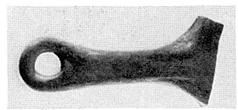 | Description: | [Originally identified as frying pan]. Handle and a small bit of adjacent rim of frying pan preserved. Flat handle, projecting from rim and pierced near its end. Micaceous cooking ware fabric; the part near the pan blackened from use. | |