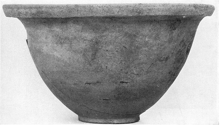 Description:   Two joining fragments preserve base and about half wall and rim. A deep basin with flaring broad projecting rim, flat on top, and raised flat base. A round hole (intentional) cut through the floor.