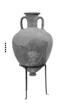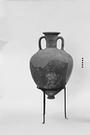 | Description: | Neck, shoulder and profile complete, but parts of wall missing; restored in plaster. Deep ovoid jar with flaring button toe, concave beneath. Mushroom rim. Sandy pink to buff fabric with a buff slip, considerably flaked. | |