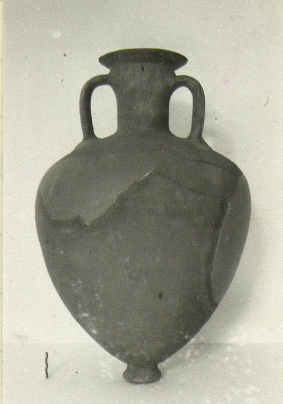 | Description: | Neck, shoulder and profile complete, but parts of wall missing; restored in plaster. Deep ovoid jar with flaring button toe, concave beneath. Mushroom rim. Sandy pink to buff fabric with a buff slip, considerably flaked. | |