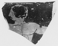 | Description: | Rim fragment. Head and shoulders of a youth, facing, looking right, both arms apparently extended. Red wash prominent; no relief contour. | |