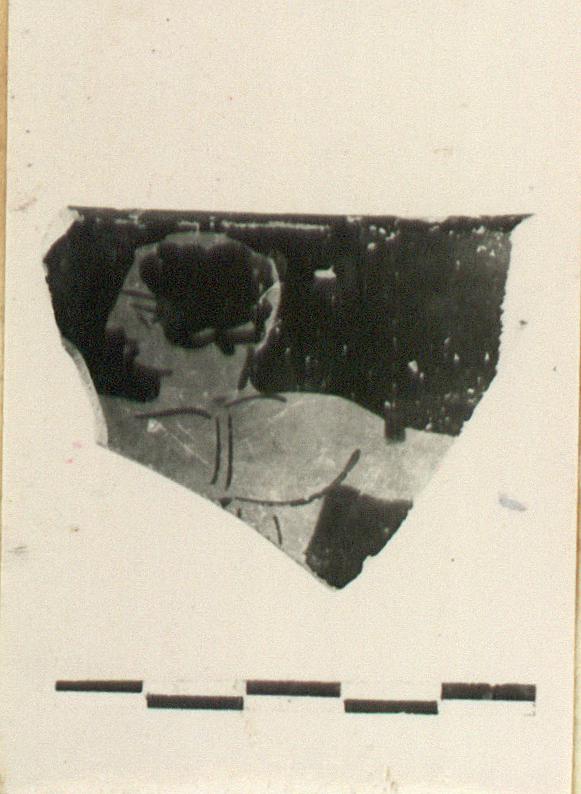 | Description: | Rim fragment. Head and shoulders of a youth, facing, looking right, both arms apparently extended. Red wash prominent; no relief contour. | |