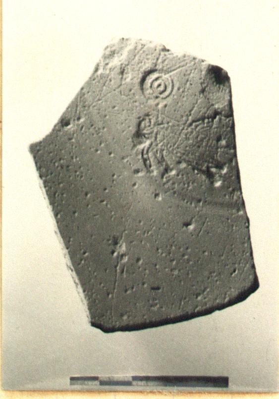 | Description: | From the bottom of a Late Roman C plate or shallow bowl. A prancing animal, perhaps a lion, within a medallion. A small disk of concentric circles in the field. Red clay and glaze, worn on the inside. | |