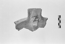 | Description: | The lug and part of the rim of a Hellenistic brazier. Satyr's head with tall cap. The tip of the beard broken away. Coarse red clay. | |
