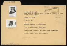 Description:   From a Hellenistic brazier. Handle and a bit of adjacent rim preserved. Bearded satyr with ivy wreath.
