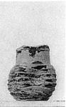 | Description: | Rim broken away. Flat bottom; the wheel-ridged body has been pinched in so as to make it four-sided. Copied from glass? Neck straight so far as preserved. Buff clay, with a dull glaze wash, red to black, much flaked, inside and out. | |