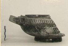 | Description: | About half preserved, including one handle and all of foot. Ribbon handle; heavy ring foot; vertical flange for lid. Above foot, rays, set off by red lines; below rim Σ-pattern. Black glaze worn outside, and very heavily worn inside. Resting surfce and space within foot reserved. A very broad and a narrow circle and dot in the space within. | |
