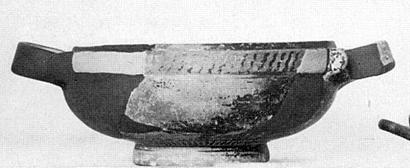 | Description: | About half preserved, including one handle and all of foot. Ribbon handle; heavy ring foot; vertical flange for lid. Above foot, rays, set off by red lines; below rim Σ-pattern. Black glaze worn outside, and very heavily worn inside. Resting surfce and space within foot reserved. A very broad and a narrow circle and dot in the space within. | |