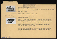 Description:   Part of one side preserved, mended from several fragments. One handle and adjacent parts of rim and body remain. Foot missing. Open skyphos with plain rim, handle, slightly uptilted, well below rim. Horizontal banding on the exterior; alternately black and reserved; inside, firm black, rather dull.