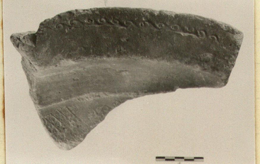 | Description: | A single fragment preserves some of rim and floor. On rim a wave pattern. On floor groups of diamonds. Rim flat on top and offset from floor; moulded outside. Coarse red tile fabric; on the exterior a buff slip; inside and on rim, dull red glaze wash. | |