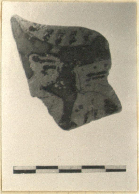 | Description: | Broken all around. Upper part of a woman to right, contemplating a casket held by a second figure. Traces of tongue pattern around knob. No relief contour. | |