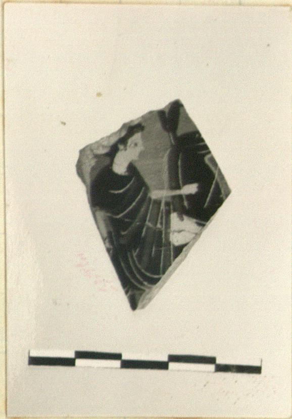 | Description: | Wall fragment, broken all around. Woman on mule to right. White for flesh; red for stripes on her cloak and on animal's mane. Clay grayish; perhaps burned. | |