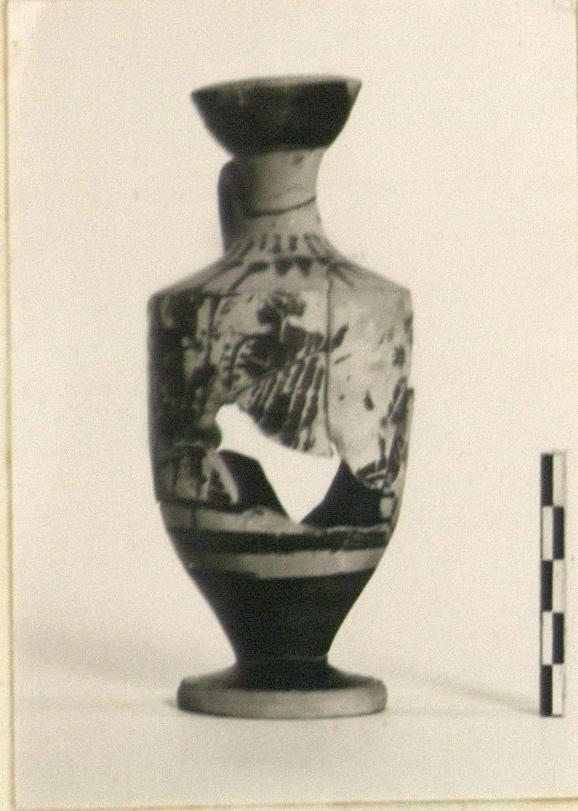 | Description: | Fragments of wall missing. Small version of general type P 24316 (ΣΑ 2526): This is the characteristic general type for the large proportion of the lekythoi from this group. Bell mouth with variations in height and spread; lip usually reserved, occasionally glazed. Disk foot of varying thickness; below picture either one or two reserved lines. Added colors more or less well preserved. Only substantial variations are noted in the following descriptions. Shoulder: strokes above rays. Scene: Achilles and Ajax gaming. Two warriors crouching; between, a woman looking left (Athena?); at right, woman moving away. | |