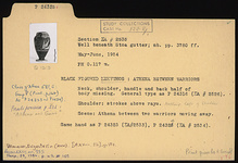 | Description: | Neck, shoulder, handle and back half of body missing. General type as P 24316 (ΣΑ 2526): This is the characteristic general type for the large proportion of the lekythoi from this group. Bell mouth with variations in height and spread; lip usually reserved, occasionally glazed. Disk foot of varying thickness; below picture either one or two reserved lines. Added colors more or less well preserved. Only substantial variations are noted in the following descriptions. Shoulder: strokes above rays. Scene: Athena between two warriors moving away. Same hand as P 24323 (ΣΑ 2533) and P 24324 (ΣΑ 2534). ADDENDA Nothing left of shoulder. | |
