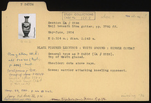 | Description: | General type as P 24316 (ΣΑ 2526): This is the characteristic general type for the large proportion of the lekythoi from this group. Bell mouth with variations in height and spread; lip usually reserved, occasionally glazed. Disk foot of varying thickness; below picture either one or two reserved lines. Added colors more or less well preserved. Only substantial variations are noted in the following descriptions. Top of mouth glazed. Shoulder: dots above rays. Scene: warrior attacking kneeling opponent. ADDENDA Missing in 1976. | |