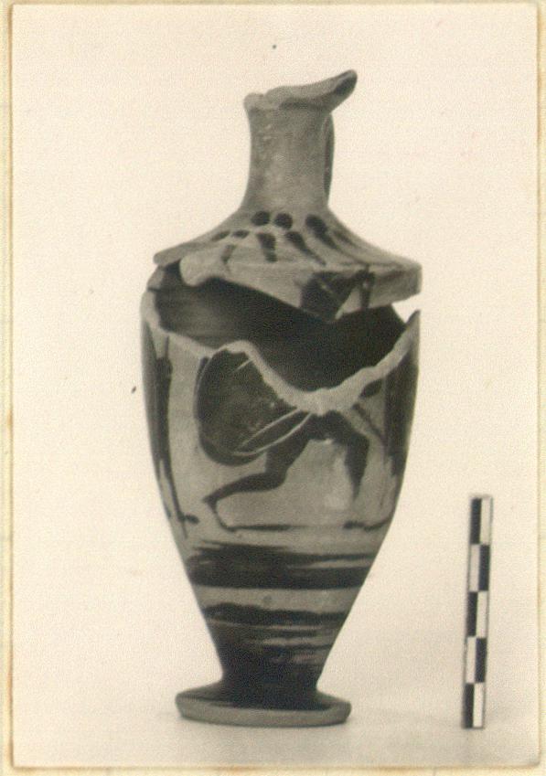 | Description: | Mouth, part of shoulder and of wall missing. General type as P 24316 (ΣΑ 2526): This is the characteristic general type for the large proportion of the lekythoi from this group. Bell mouth with variations in height and spread; lip usually reserved, occasionally glazed. Disk foot of varying thickness; below picture either one or two reserved lines. Added colors more or less well preserved. Only substantial variations are noted in the following descriptions. Shoulder: dots above rays. Scene: warrior running to right; on each side draped figure holding spear. By the same hand as P 24340 - P 24349 (ΣΑ 2550 - ΣΑ 2559) and P 24351 - P 24352 (ΣΑ 2561 - ΣΑ 2562). | |