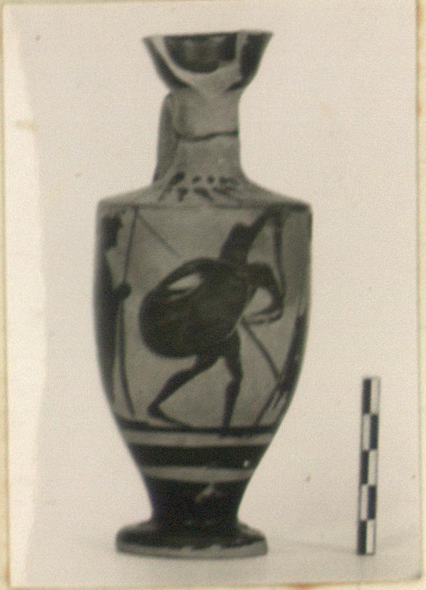 | Description: | Fragment missing from mouth. General type as P 24316 (ΣΑ 2526): This is the characteristic general type for the large proportion of the lekythoi from this group. Bell mouth with variations in height and spread; lip usually reserved, occasionally glazed. Disk foot of varying thickness; below picture either one or two reserved lines. Added colors more or less well preserved. Only substantial variations are noted in the following descriptions. Shoulder: dots above rays. Scene: warrior hurrying right; on each side draped figure holding spear. Same hand as P 24339 (ΣΑ 2549). | |