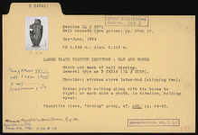 | Description: | Mouth and much of wall missing. General type as P 24316 (ΣΑ 2526): This is the characteristic general type for the large proportion of the lekythoi from this group. Bell mouth with variations in height and spread; lip usually reserved, occasionally glazed. Disk foot of varying thickness; below picture either one or two reserved lines. Added colors more or less well preserved. Only substantial variations are noted in the following descriptions. Shoulder: strokes above lotus bud (skipping two). Scene: youth walking along with his horse to right; on each side a youth in himation, holding spear. Phanyllis class, "Arming" group, cf. Haspels (1936), pp. 64-65. ADDENDA Conservation, vol. I-3, 4. | |