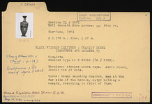 | Description: | Complete. General type as P 24316 (ΣΑ 2526): This is the characteristic general type for the large proportion of the lekythoi from this group. Bell mouth with variations in height and spread; lip usually reserved, occasionally glazed. Disk foot of varying thickness; below picture either one or two reserved lines. Added colors more or less well preserved. Only substantial variations are noted in the following descriptions. Shoulder: strokes above rays. Above scene, double row of dots. Scene: woman mounting chariot, man at the far side of the horses, Satyr holding a wreath, crouching in front of them. ADDENDA Conservation, vol. I-3, 4. | |