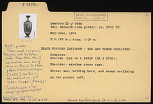 | Description: | Complete. General type as P 24316 (ΣΑ 2526): This is the characteristic general type for the large proportion of the lekythoi from this group. Bell mouth with variations in height and spread; lip usually reserved, occasionally glazed. Disk foot of varying thickness; below picture either one or two reserved lines. Added colors more or less well preserved. Only substantial variations are noted in the following descriptions. Shoulder: strokes above rays. Scene: man, holding horn, and woman reclining on the ground left. | |