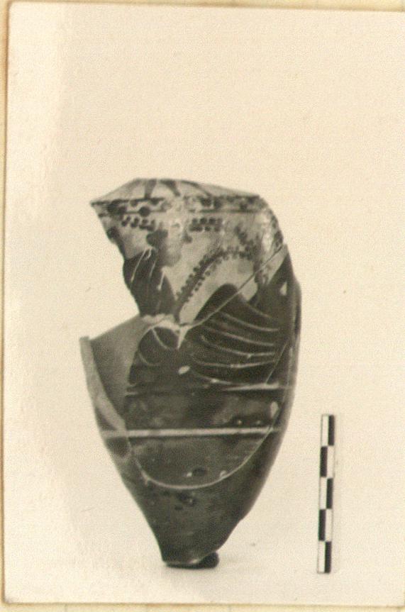 | Description: | Lower half, except foot, part of upper wall and of shoulder, preserved. General type as P 24316 (ΣΑ 2526): This is the characteristic general type for the large proportion of the lekythoi from this group. Bell mouth with variations in height and spread; lip usually reserved, occasionally glazed. Disk foot of varying thickness; below picture either one or two reserved lines. Added colors more or less well preserved. Only substantial variations are noted in the following descriptions. Shoulder: rays preserved. Above scene: double row of dots. Scene: two figures reclining on the ground left (face of the left one preserved; no white). | |