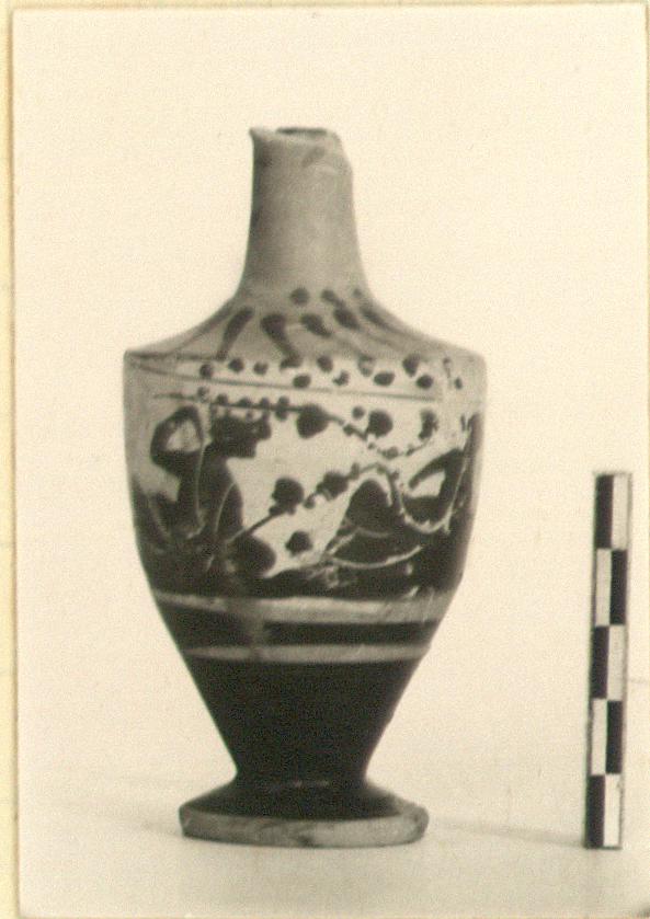 | Description: | White Ground. Mouth missing. General type as P 24316 (ΣΑ 2526): This is the characteristic general type for the large proportion of the lekythoi from this group. Bell mouth with variations in height and spread; lip usually reserved, occasionally glazed. Disk foot of varying thickness; below picture either one or two reserved lines. Added colors more or less well preserved. Only substantial variations are noted in the following descriptions. Shoulder: dots above rays. Above scene: double row of dots. Scene: two figures reclining on the ground left. | |