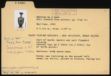 | Description: | Part of mouth, handle and wall fragment missing. General type as P 24316 (ΣΑ 2526): This is the characteristic general type for the large proportion of the lekythoi from this group. Bell mouth with variations in height and spread; lip usually reserved, occasionally glazed. Disk foot of varying thickness; below picture either one or two reserved lines. Added colors more or less well preserved. Only substantial variations are noted in the following descriptions. Top of mouth glazed. Shoulder: dots above rays. Scene: man reclining on the ground left, woman (no white), seated on diphros, facing him. | |