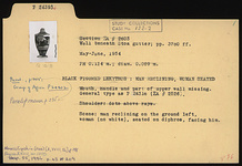 | Description: | Mouth, handle and part of upper wall missing. General type as P 24316 (ΣΑ 2526): This is the characteristic general type for the large proportion of the lekythoi from this group. Bell mouth with variations in height and spread; lip usually reserved, occasionally glazed. Disk foot of varying thickness; below picture either one or two reserved lines. Added colors more or less well preserved. Only substantial variations are noted in the following descriptions. Shoulder: dots above rays. Scene: man reclining on the ground left, woman (no white), seated on diphros, facing him. | |