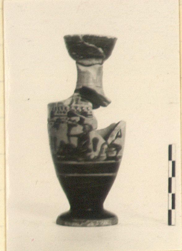 | Description: | Handle, much of shoulder and upper wall missing. General type as P 24316 (ΣΑ 2526): This is the characteristic general type for the large proportion of the lekythoi from this group. Bell mouth with variations in height and spread; lip usually reserved, occasionally glazed. Disk foot of varying thickness; below picture either one or two reserved lines. Added colors more or less well preserved. Only substantial variations are noted in the following descriptions. Shoulder: dots above rays. Above scene: double row of dots. Scene: Dionysos reclining on ground, holding horn; on each side, crouching Satyr. On the underside of the base, two lines of glaze drawn as if to make an X, but skipping the wheel indentation at the center. Cf. P 24493 (ΣΑ 2703) for this mark and for style. ADDENDA Conservation, vol. I-3,4. | |