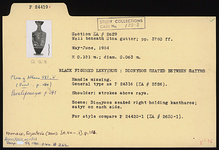 | Description: | Handle missing. General type as P 24316 (ΣΑ 2526): This is the characteristic general type for the large proportion of the lekythoi from this group. Bell mouth with variations in height and spread; lip usually reserved, occasionally glazed. Disk foot of varying thickness; below picture either one or two reserved lines. Added colors more or less well preserved. Only substantial variations are noted in the following descriptions. Shoulder: strokes above rays. Scene: Dionysos seated right holding kantharos; Satyr on each side. For style cf. P 24420 - P 24421 (ΣΑ 2630 - ΣΑ 2631). | |