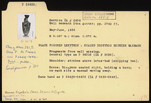 | Description: | Fragments from wall missing. General type as P 24316 (ΣΑ 2526): This is the characteristic general type for the large proportion of the lekythoi from this group. Bell mouth with variations in height and spread; lip usually reserved, occasionally glazed. Disk foot of varying thickness; below picture either one or two reserved lines. Added colors more or less well preserved. Only substantial variations are noted in the following descriptions. Shoulder: strokes above lotus bud (skipping two). Scene: Dionysos seated right, holding a horn; on each side a Maenad moving away. Same hand as P 24429 - P 24432 (ΣΑ 2639 - ΣΑ 2642). | |